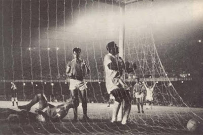 | Pelé marca um dos seus 5 gols nos dois jogos contra o Benfica |